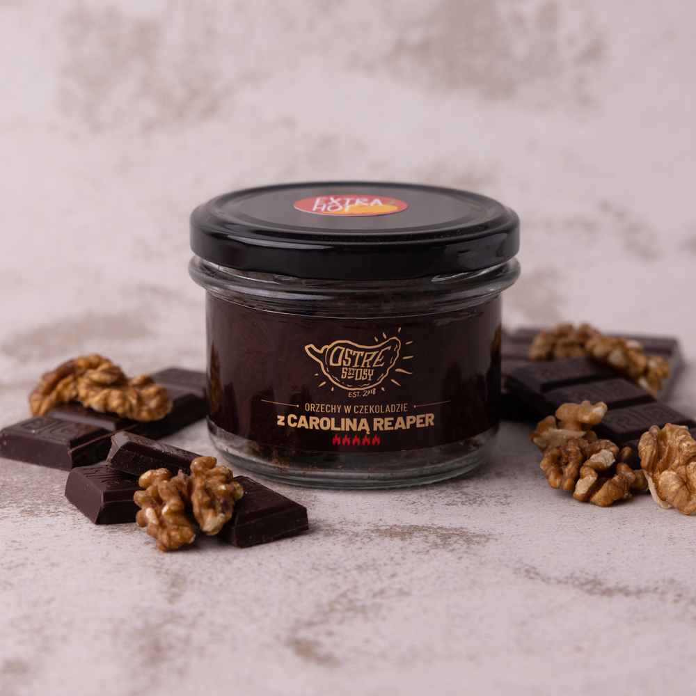 Najostrzejsza z naszych propozycji – mielone orzechy włoskie zatopione w głębokiej, wytrawnej gorzkiej czekoladzie, z dodatkiem Carolina Reaper – jednej z najostrzejszych papryk na świecie. To intensywny smakowy rollercoaster, który łączy luksusową gorycz czekolady z ekstremalnym ogniem. Tylko dla odważnych!